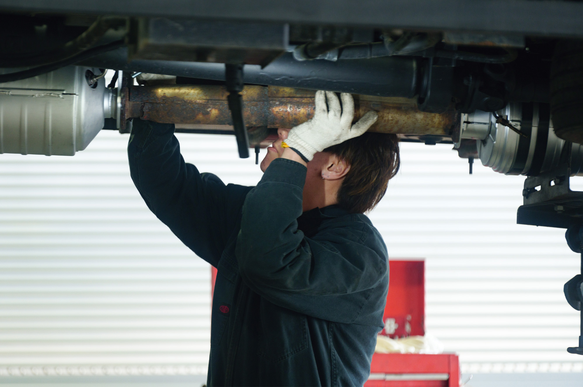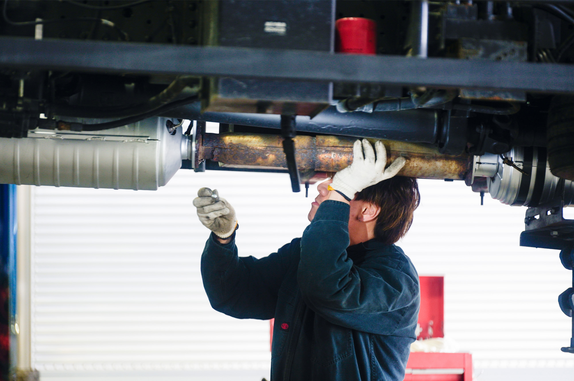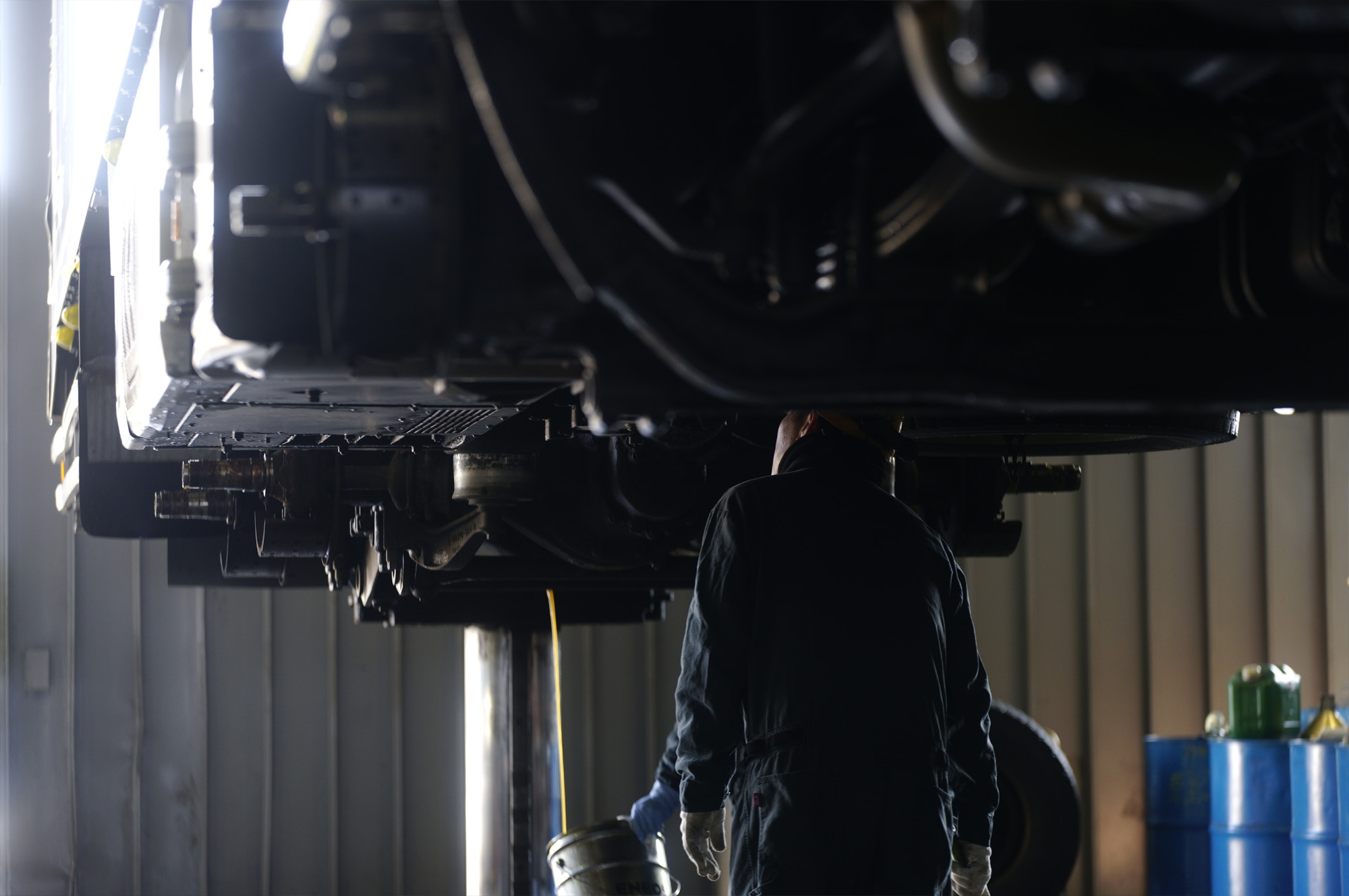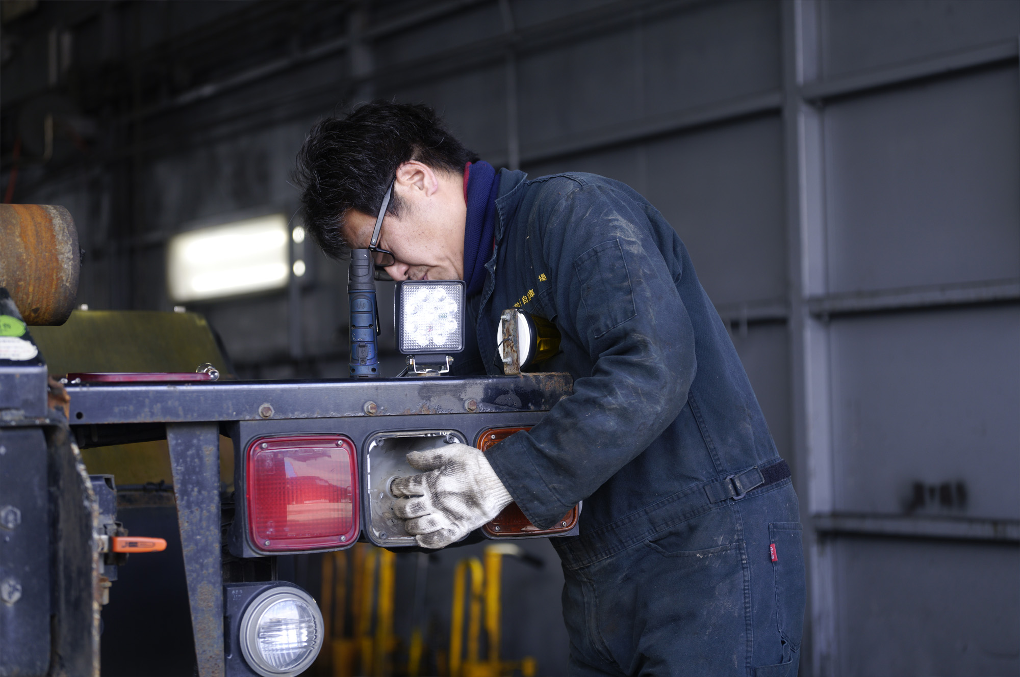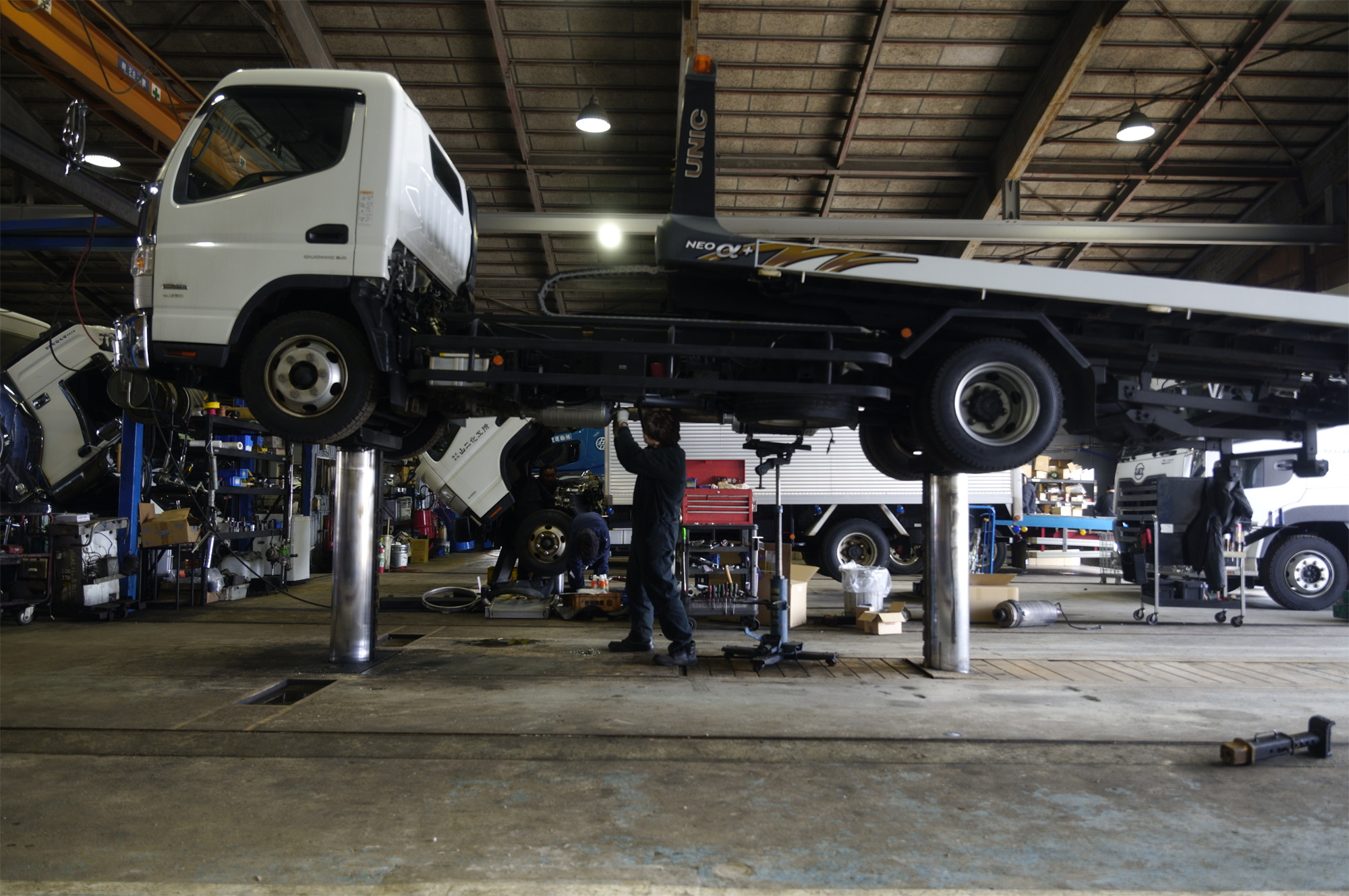 5,000㎡の敷地内に約3,000㎡の整備工場を構え、6つのトラック整備ストール、検査ライン、大型車用塗装ブースを備えています。県内最大級の整備工場として万全の体制で運送事業者をサポートしています。